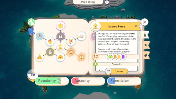 Humanity would always experience a compulsive need to believe in something bigger than ourselves. They would search for comfort in the darkness: the light that would enlighten their path in the shadows of millennia. For millions of people at all times this light used to be and still is faith. It was religion that became this guiding light which gave many people the meaning of their lives in this universe, helped them to hold out against the storms of changes and to come ashore of happiness. There are many religions in the world. Each of them gave its own response to the defiance of times and changes. But what other way could this process go? What other diversified and bizarre shapes did human beliefs take? The answers to these questions you will find in our new game. Create your own unique religion. Test if it can hold against the challenges of the times, the pressure of obstacles and bring the humanity together.